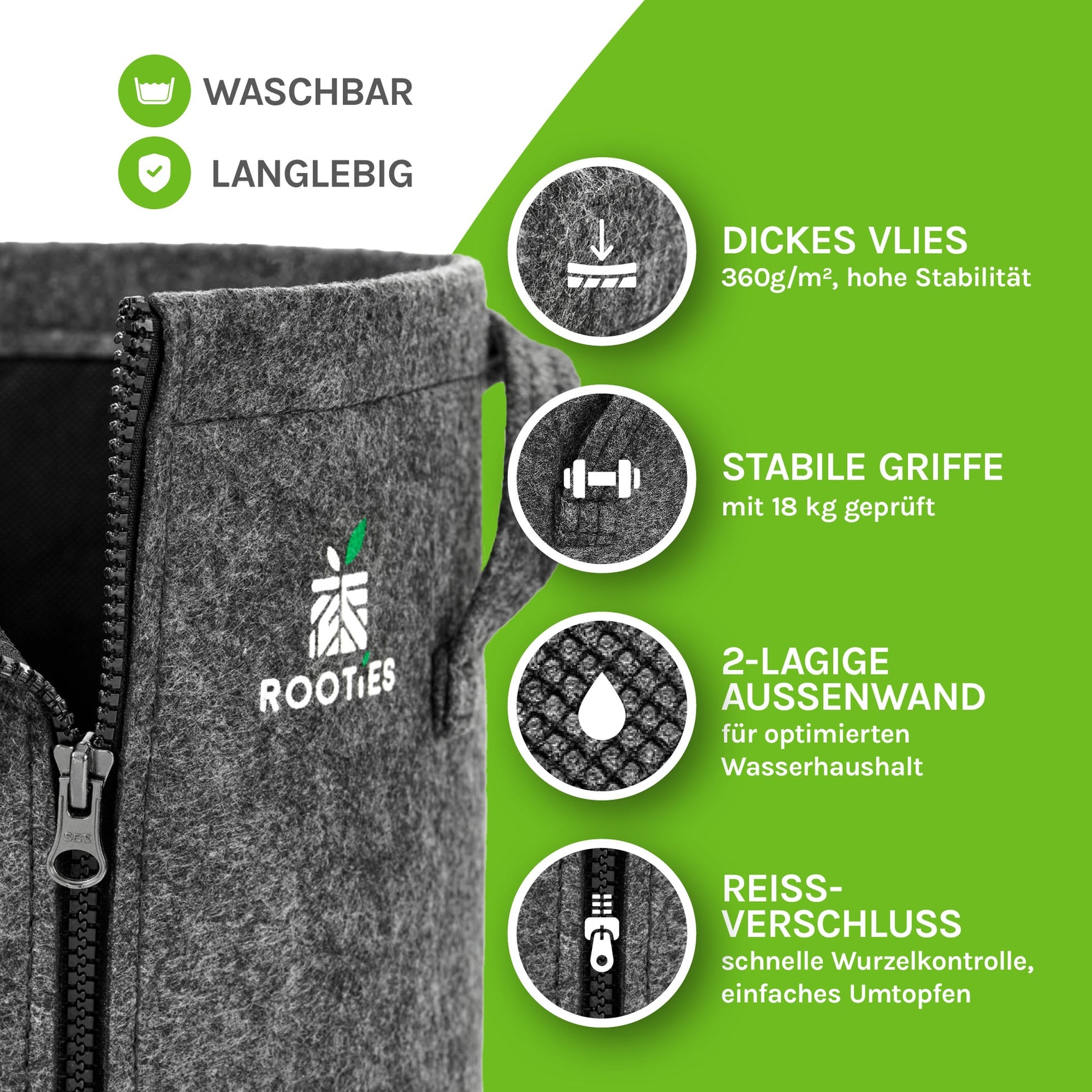 Zusammen mit erfahrenen Indoor-Growern entwickelt, ist dieser Topf die ideale Lösung für dein Growzelt und nutzt jeden Zentimeter Platz dank seiner durchdachten Form optimal aus. Ausgestattet mit einem praktischen Gießrand, ist er unserer Meinung nach die erste Wahl für Pflanzen mit tiefen Wurzeln. Das atmungsaktive Material unterstützt Air-Pruning, fördert eine gesunde Wurzelentwicklung und sorgt für eine effiziente Aufnahme von Wasser und Nährstoffen. Die innovative Innenmembran reguliert die Feuchtigkeit ideal und verhindert Staunässe. Robuste Griffe und ein stabiler Reißverschluss garantieren zudem eine einfache Handhabung und präzise Kontrolle der Wurzeln. Überzeuge dich selbst von diesem Topf, der deinen Pflanzen das Wachstum bietet, das sie verdienen!